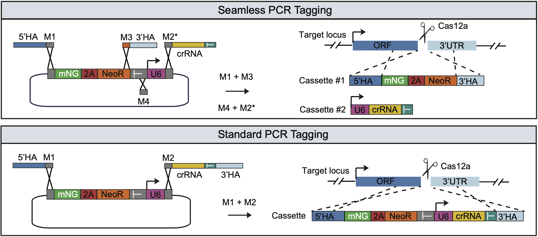 - two gene specific tagging oligos (M1 and M2) provide the homology arms (50 to 90 nts in length) for targeted integration by HDR